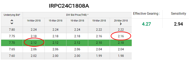 จากรูปข้างบนนะครับ เราจะเห็นว่า ถ้าเราซื้อ IRPC24C1808A ได้ที่ 2.12 บาท แล้วถือไว้อีกอาทิตย์นึง จนหุ้นแม่ขึ้นไป 1 ช่อง เราก็ยังสามารถขายได้ที่ 2.16 บาท แต่ในทางกลับกัน ถ้าเราซื้อ DW ที่มี Sensitivity ใกล้เคียง 1 แล้วเราถือในระยะเวลาที่เท่ากัน บางทีถึงแม้หุ้นแม่จะขึ้นไปแล้ว 1 ช่อง แต่เราก็อาจจะขาย DW ได้ที่ราคาเท่าทุนหรือขาดทุนก็เป็นได้ เนื่องมาจาก Time Decay ที่ลดลงไปในแต่ละวันไงครับ